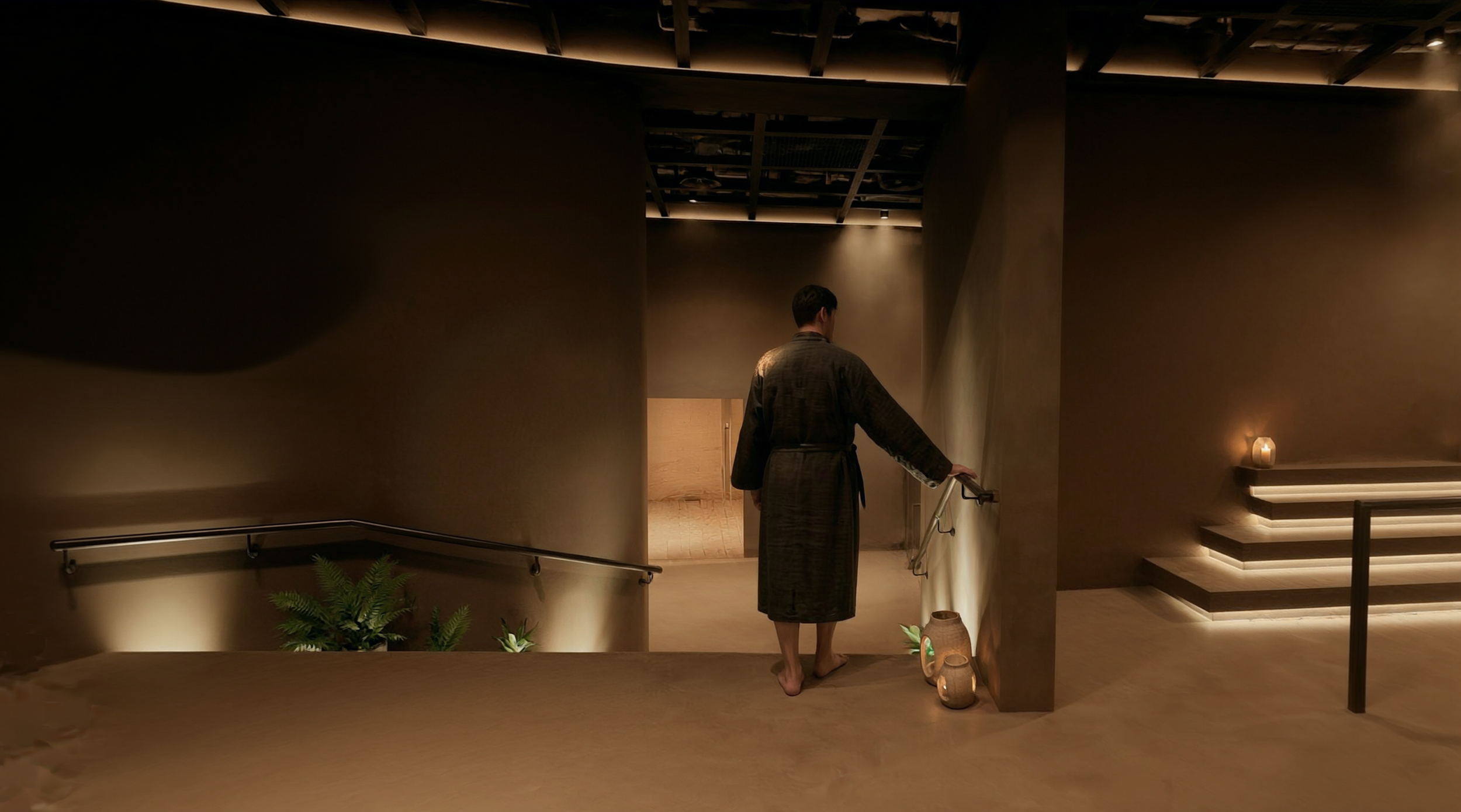 The light is designed by circadian rhythms. Warm in the pools, bright in the steam and sauna, soft in the rain room, open sky in the cold plunge, golden in the rest. You're not just moving through spaces. You're being guided through a journey that your body recognizes as medicine.